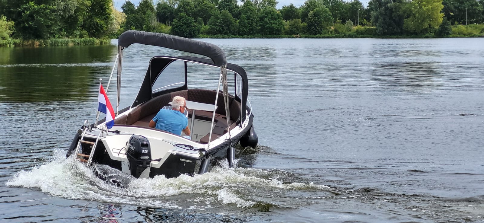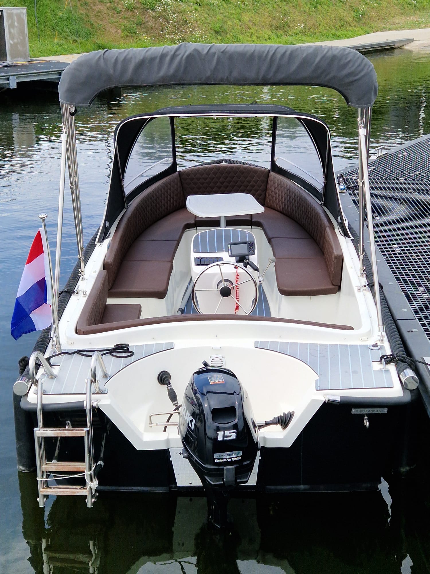 RioMar 515 met 15 pk motor, in drie delen neerklapbare kap, voorzien van zitbanken rondom, tafel, zwemtrap, biminitop