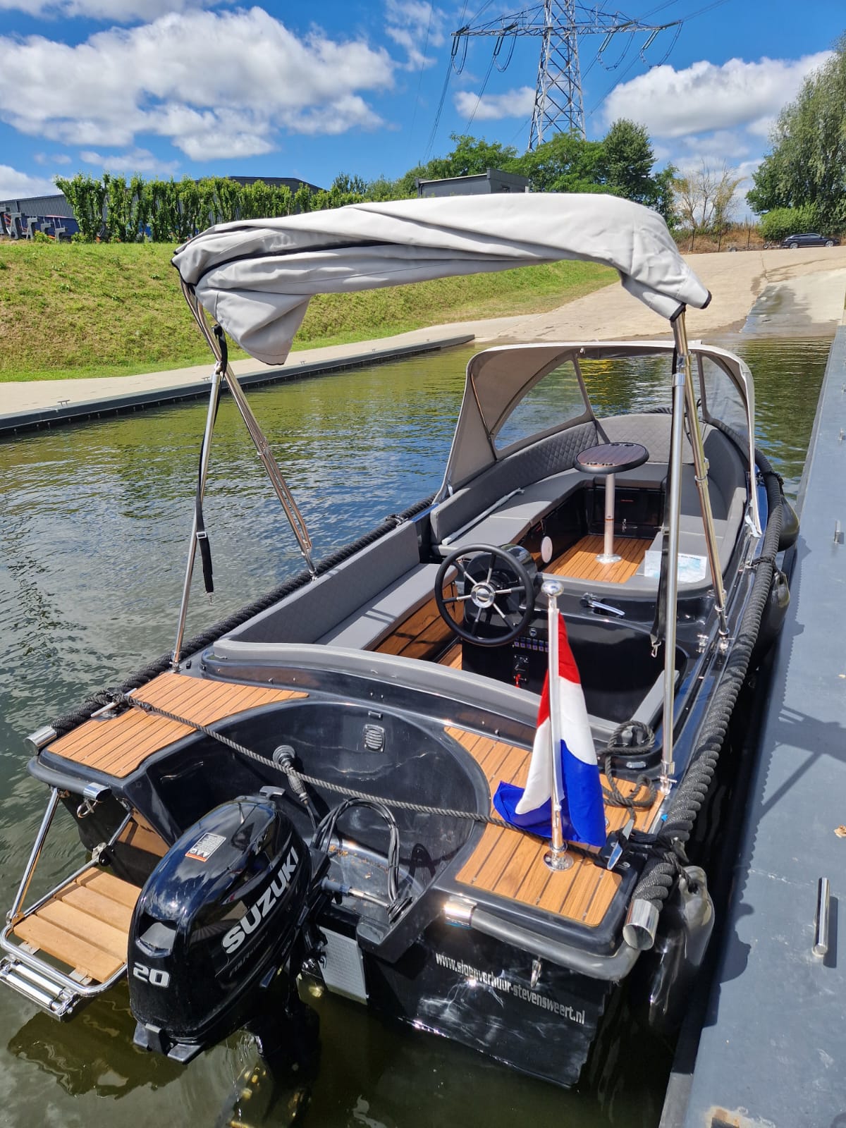 RioMar 570 met 20 pk motor, in drie delen neerklapbare kap, voorzien van zitbanken rondom, tafel, radio, zwemtrap, biminitop