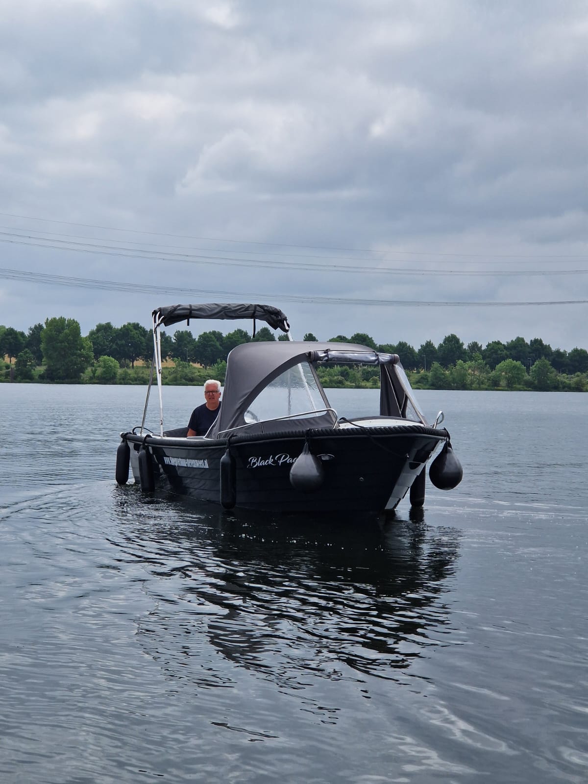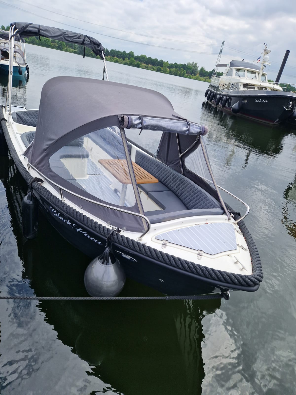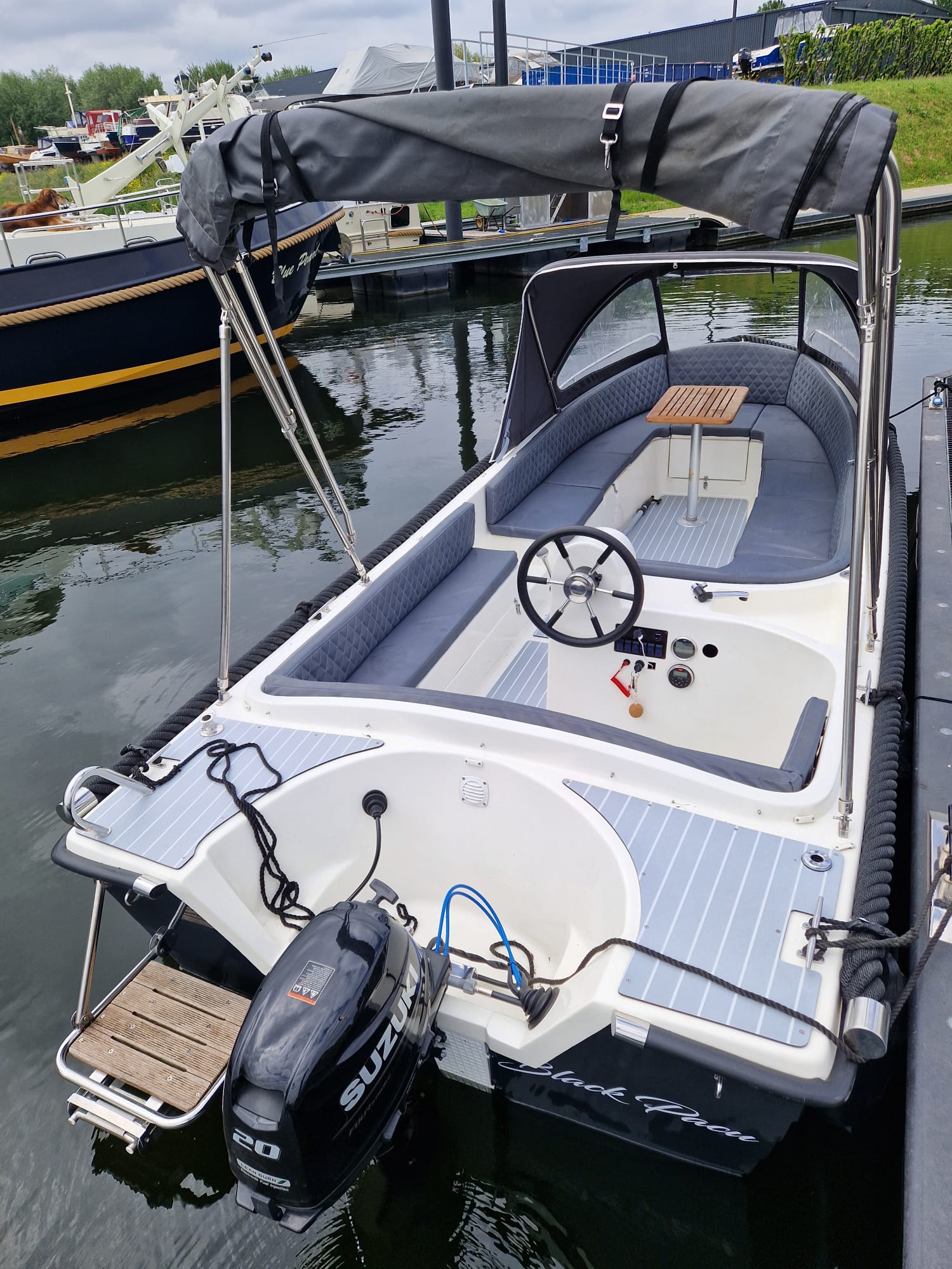 RioMar 570 met 20 pk motor, In drie delen neerklapbare kap, Voorzien van zitbanken rondom, Tafel, Radio, Zwemtrap, Biminitop