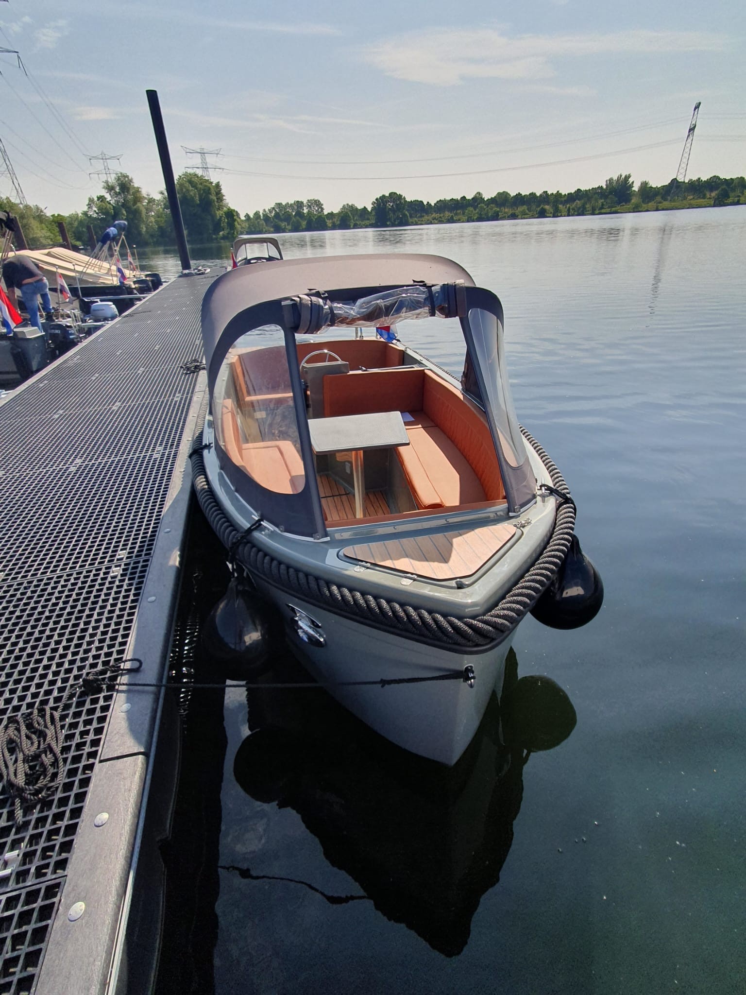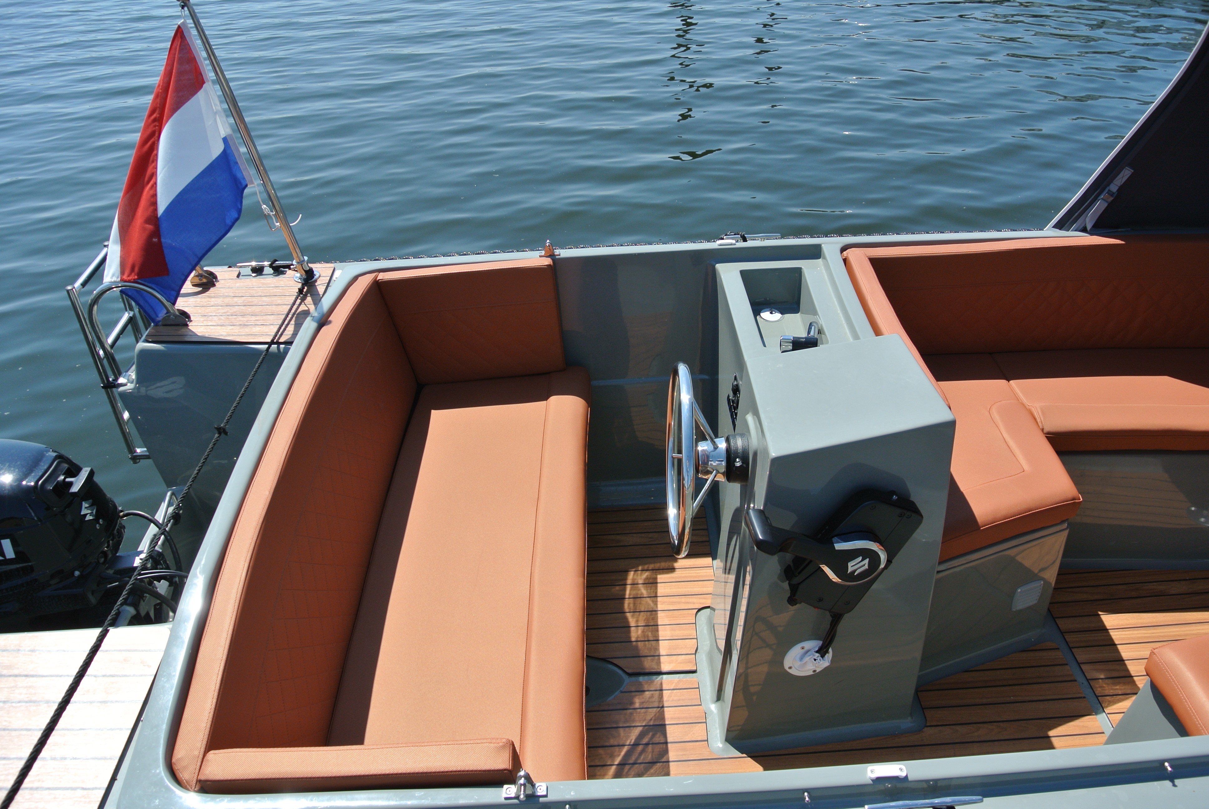 RioMar 490 met 15 pk motor, in drie delen neerklapbare kap, voorzien van zitbanken rondom, tafel, radio, biminitop, zwemtrap