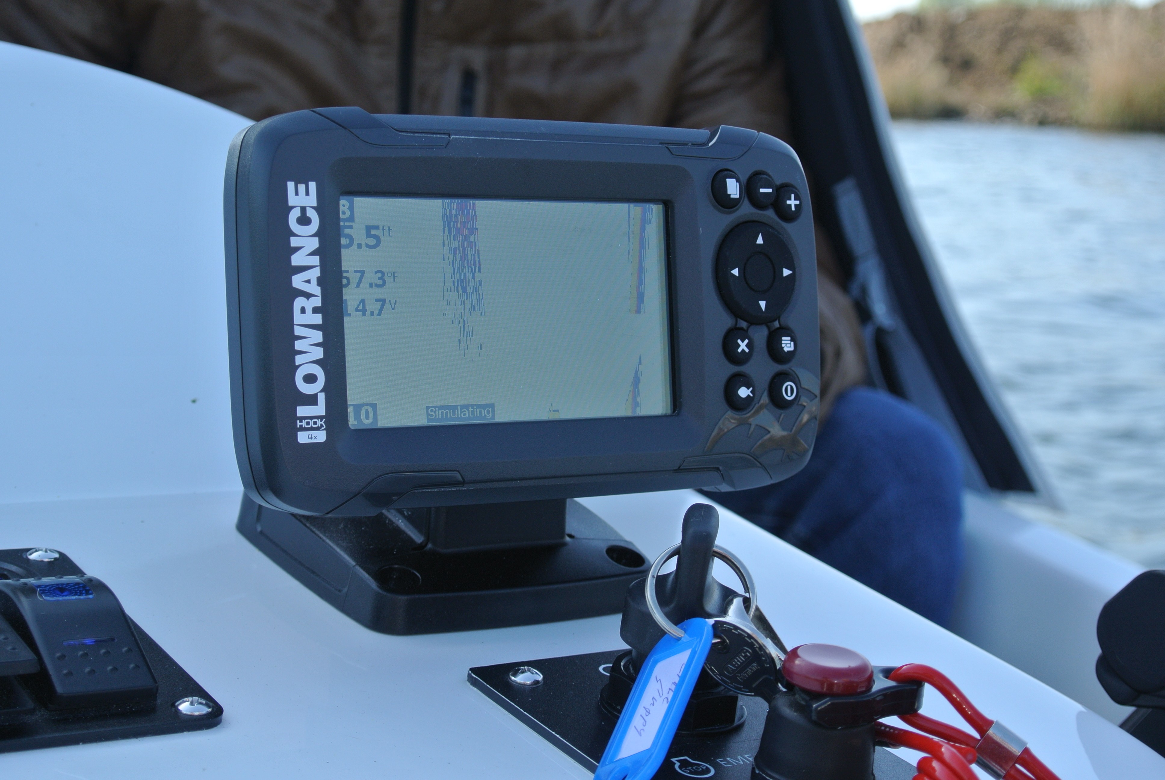 RioMar 455 met 9 pk motor, voorzien van zitbanken rondom, tafel, dieptemeter, biminitop, zwemtrap