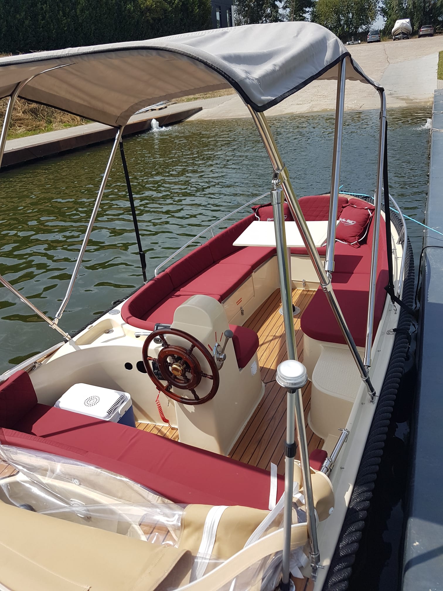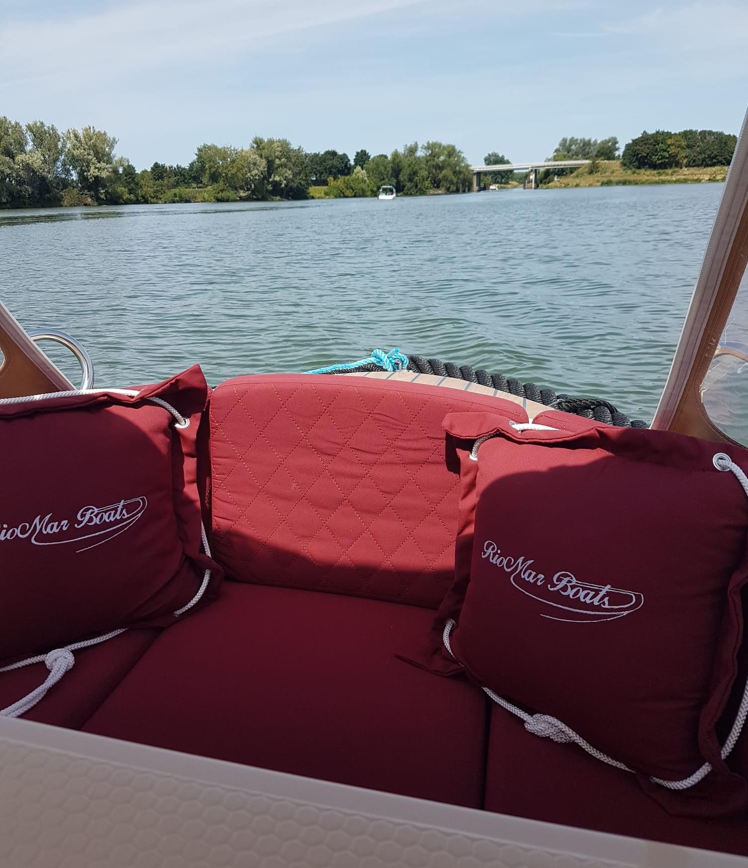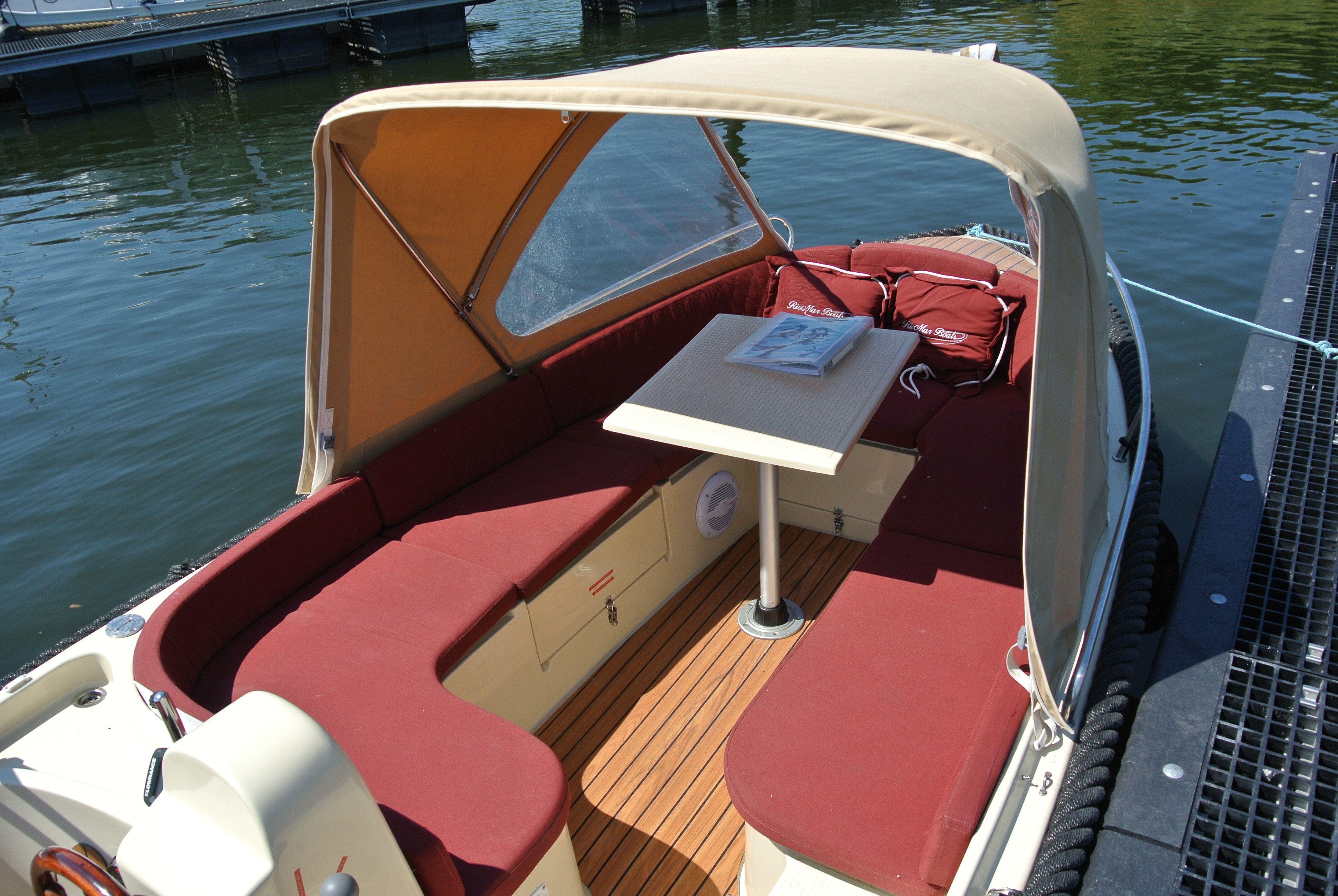 RioMar 470 met 15 pk motor, in twee delen neerklapbare kap, voorzien van zitbanken rondom, tafel, radio, dieptemeter, biminitop, zwemtrap